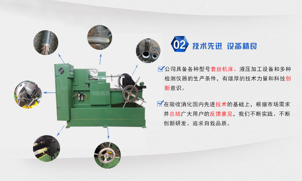 圓鋼套絲機(jī)也是管螺紋套絲機(jī)的一種,是一款多功能套絲機(jī),被加工工件加在對(duì)口鉗上,隨手扳動(dòng)手輪螺紋就會(huì)自動(dòng)拉住工件進(jìn)行切削螺紋,切削螺紋長(zhǎng)度有床身中裝帶擋鐵的聯(lián)桿來(lái)控制切削螺紋的長(zhǎng)度,螺紋切頭由聯(lián)桿轉(zhuǎn)動(dòng)便會(huì)自動(dòng)脫開(kāi),主軸由各級(jí)轉(zhuǎn)速調(diào)整方便。本公司立足于先進(jìn)的技術(shù)能力和全新的經(jīng)營(yíng)理念,擁有行業(yè)優(yōu)秀的專家,公司研發(fā)隊(duì)伍和營(yíng)銷團(tuán)隊(duì)均由試驗(yàn)機(jī)行業(yè)和機(jī)床行業(yè)的精英組成,具備承接各類通用設(shè)備、專用設(shè)備的設(shè)計(jì)、生產(chǎn)、服務(wù)能力,并以解決用戶在試驗(yàn)過(guò)程中遇到的各種問(wèn)題為突出特點(diǎn),瑞捷套絲機(jī)生產(chǎn)公司是一家專業(yè)解決套絲問(wèn)題的專家。我公司不但擁有現(xiàn)代化的生產(chǎn)設(shè)備、優(yōu)秀的技術(shù)人才,并隨時(shí)注入與新技術(shù)進(jìn)行新產(chǎn)品的開(kāi)發(fā)和應(yīng)用,保證技術(shù)和產(chǎn)品的先進(jìn)性,以滿足用戶需求為己任,為用戶提供從設(shè)計(jì)、生產(chǎn)到培訓(xùn)等人性化的全面服務(wù),提供真正適合用戶需要的先進(jìn)的個(gè)性化產(chǎn)品。